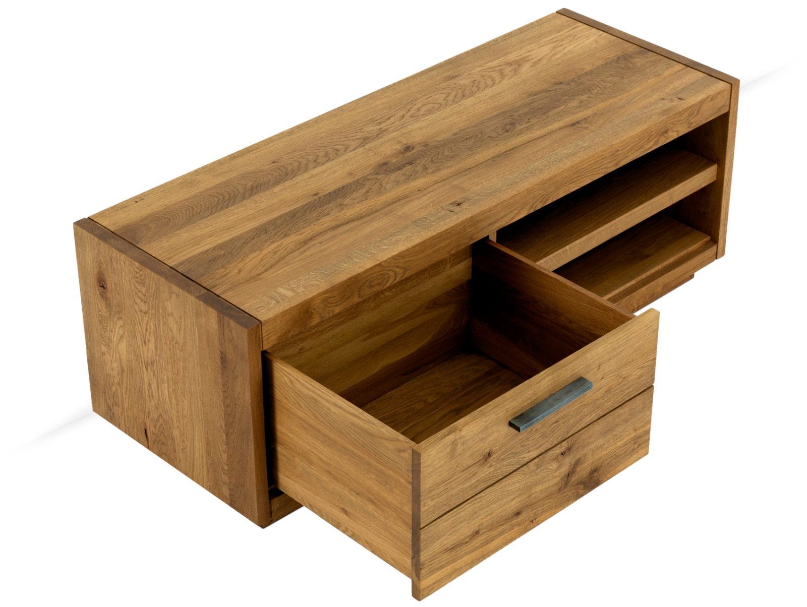 100% lemn masiv. Spatele si panoul de fund al sertarului sunt fabricate din placaj furniruit cu furnir de stejar. Despartitorul vertical si panoul de fund al corpului sunt fabricate din panel furniruit cu furnir de stejar. Toate celelalte componente sunt fabricate din lemn masiv de stejar.