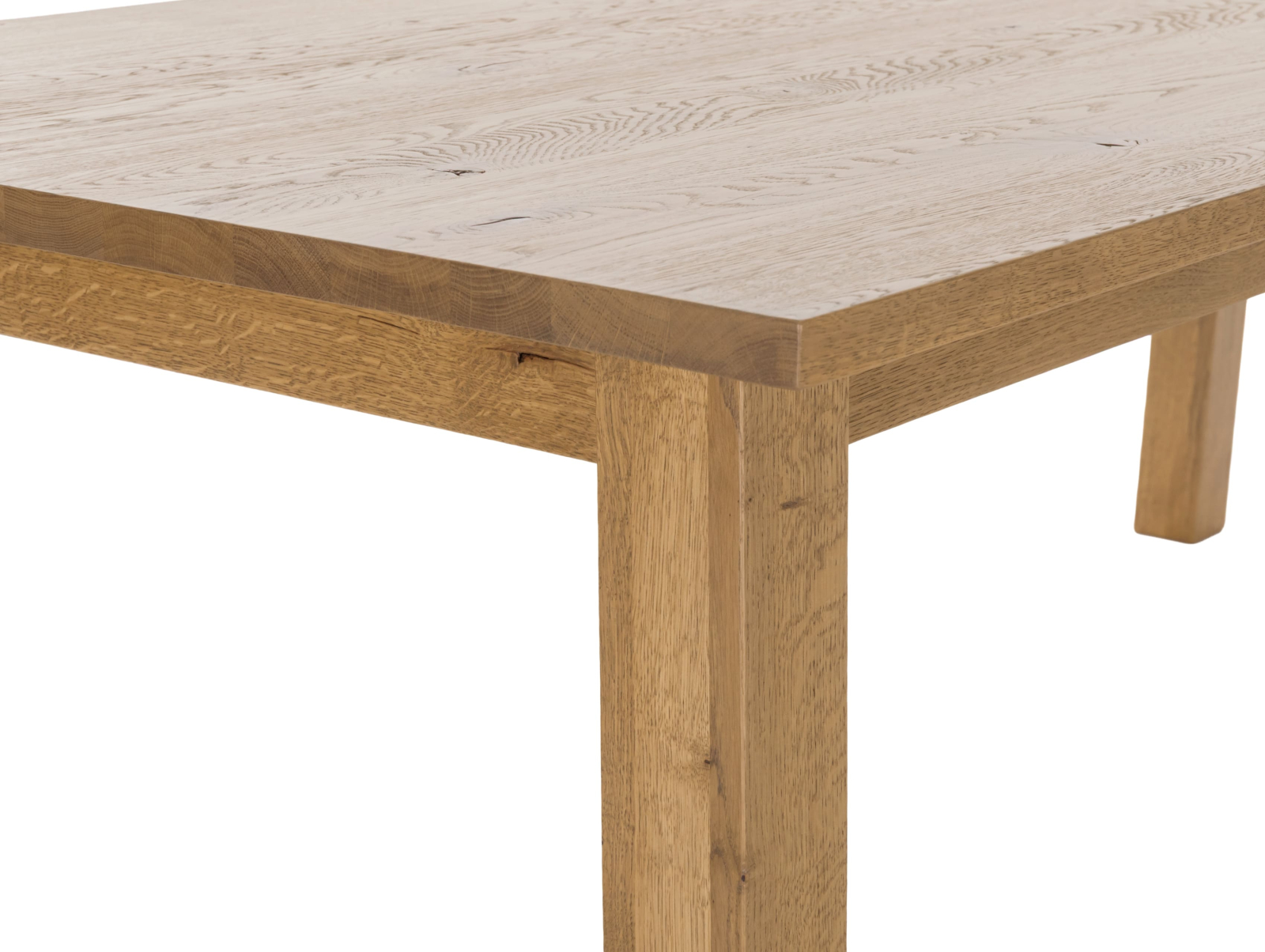 In general, eventualele noduri si crapaturi naturale sunt chituite, dar pot sa apara si unele care prezinta prelucrari discrete de tipul slefuirilor si daltuirilor. Suprafetele sunt raschetate pentru a pune in valoare frumusetea naturala a lemnului de stejar.