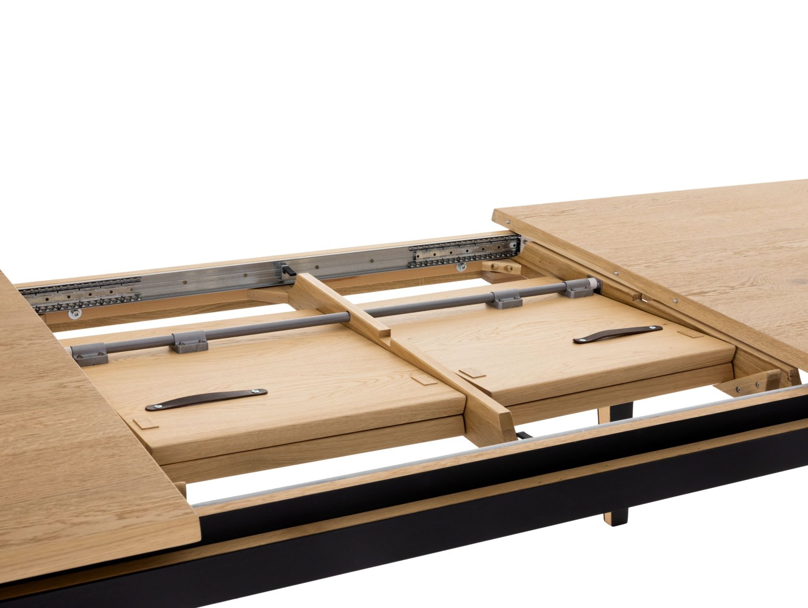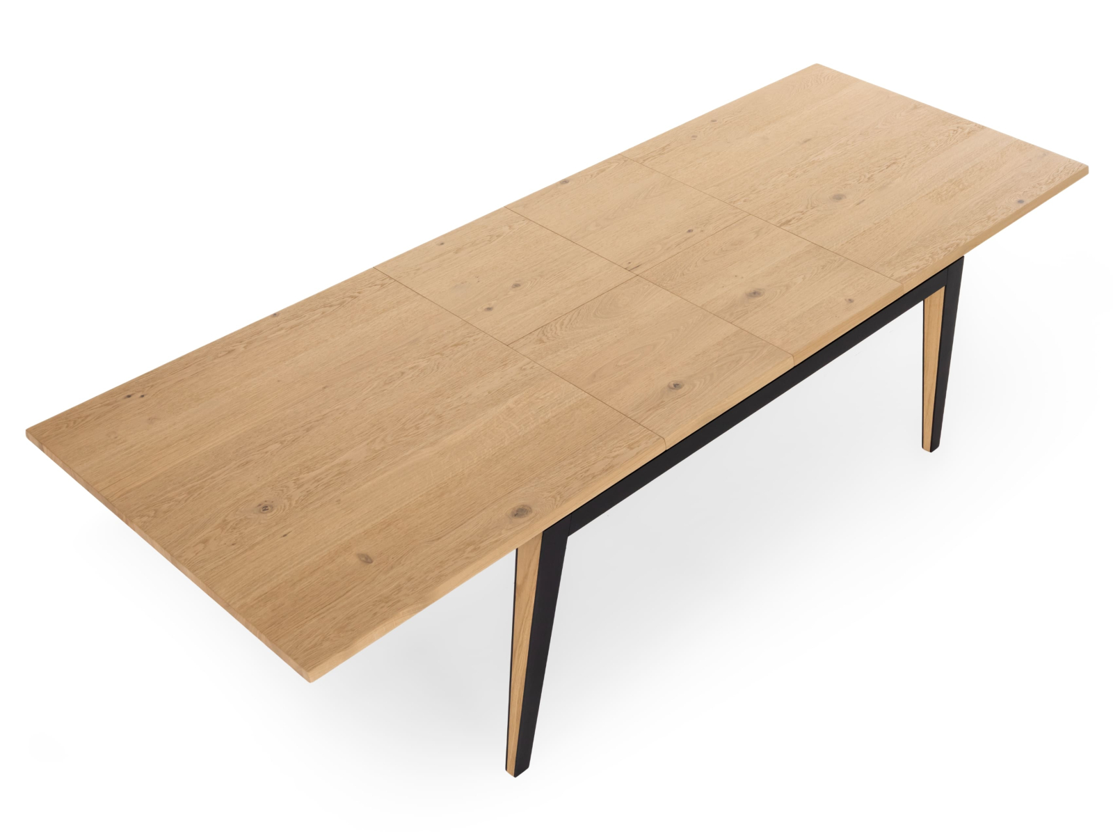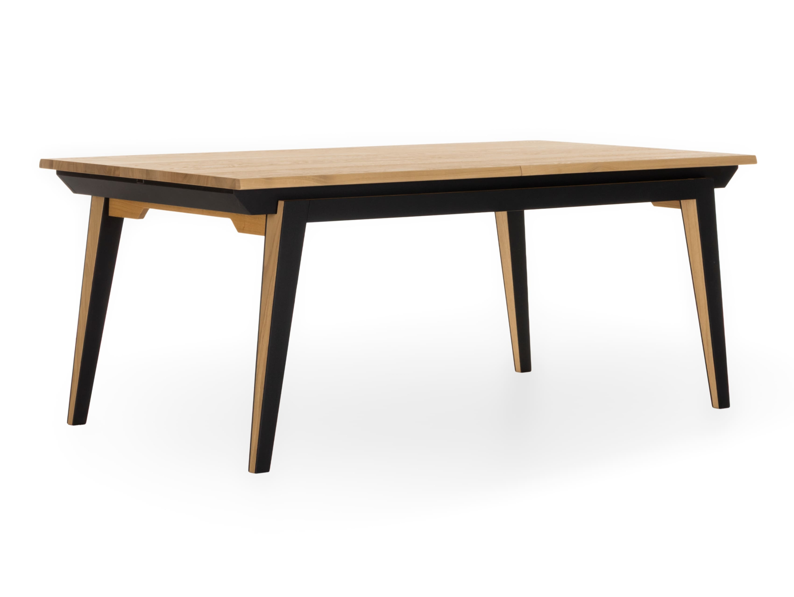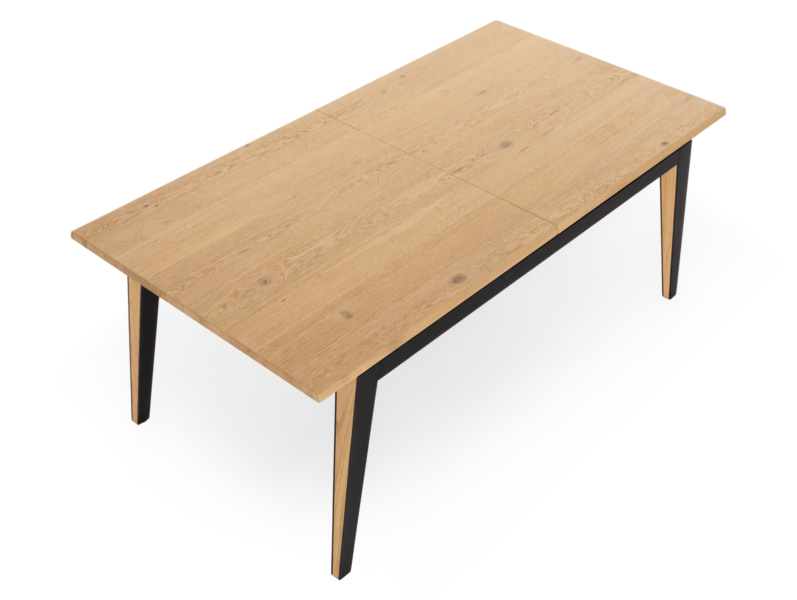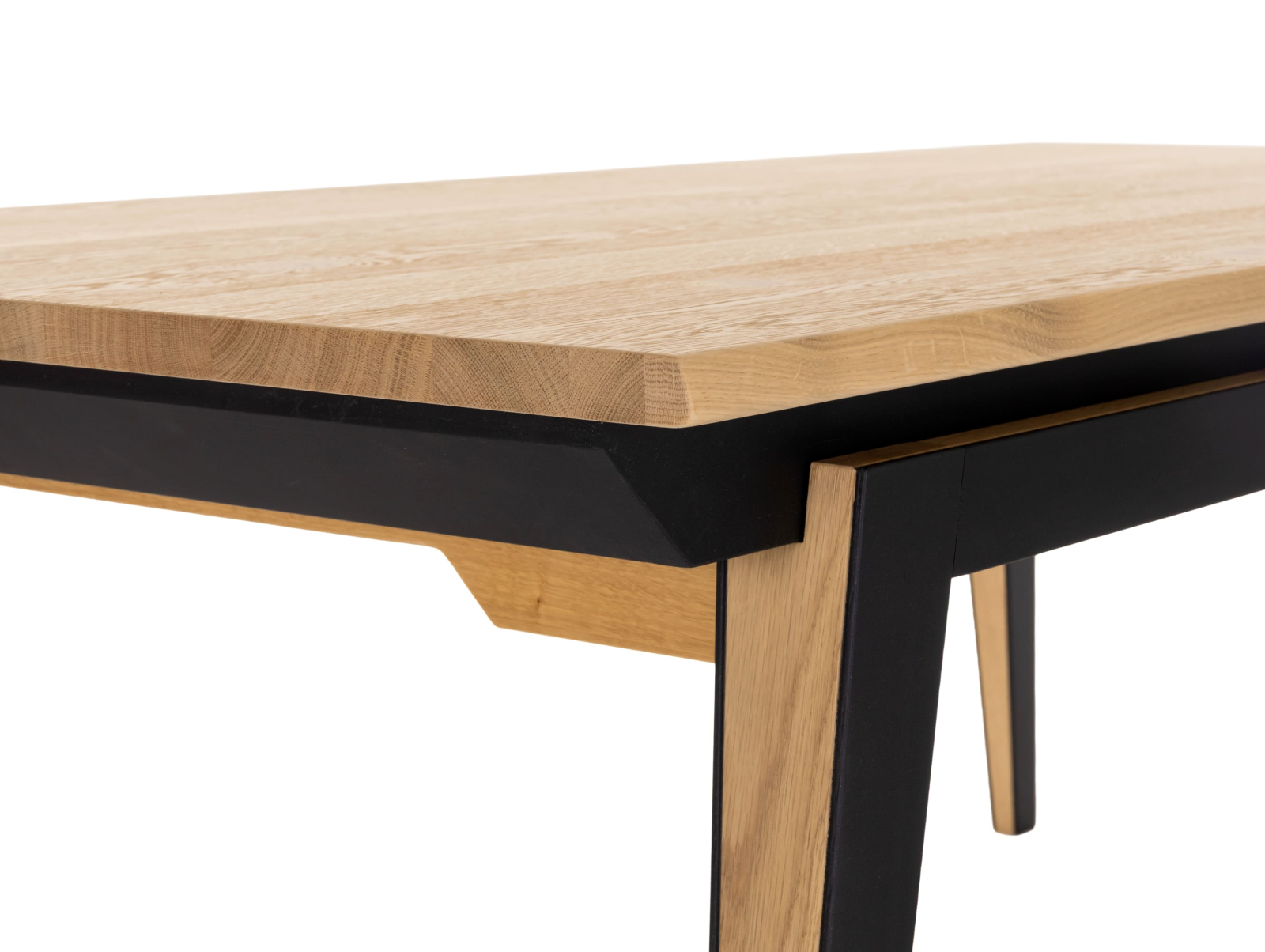 Picioarele si traversele interioare sunt fabricate din lemn masiv de stejar cu ciclu lung de uscare. Targurile sunt fabricate din lemn masiv de fag furniruit cu stejar. Placa si extensia sunt fabricate din PAL bordurat cu stejar masiv si furniruit cu furnir de stejar pe fata si de fag pe dos pentru placa, respectiv furnir de stejar pe ambele fete pentru extensie.