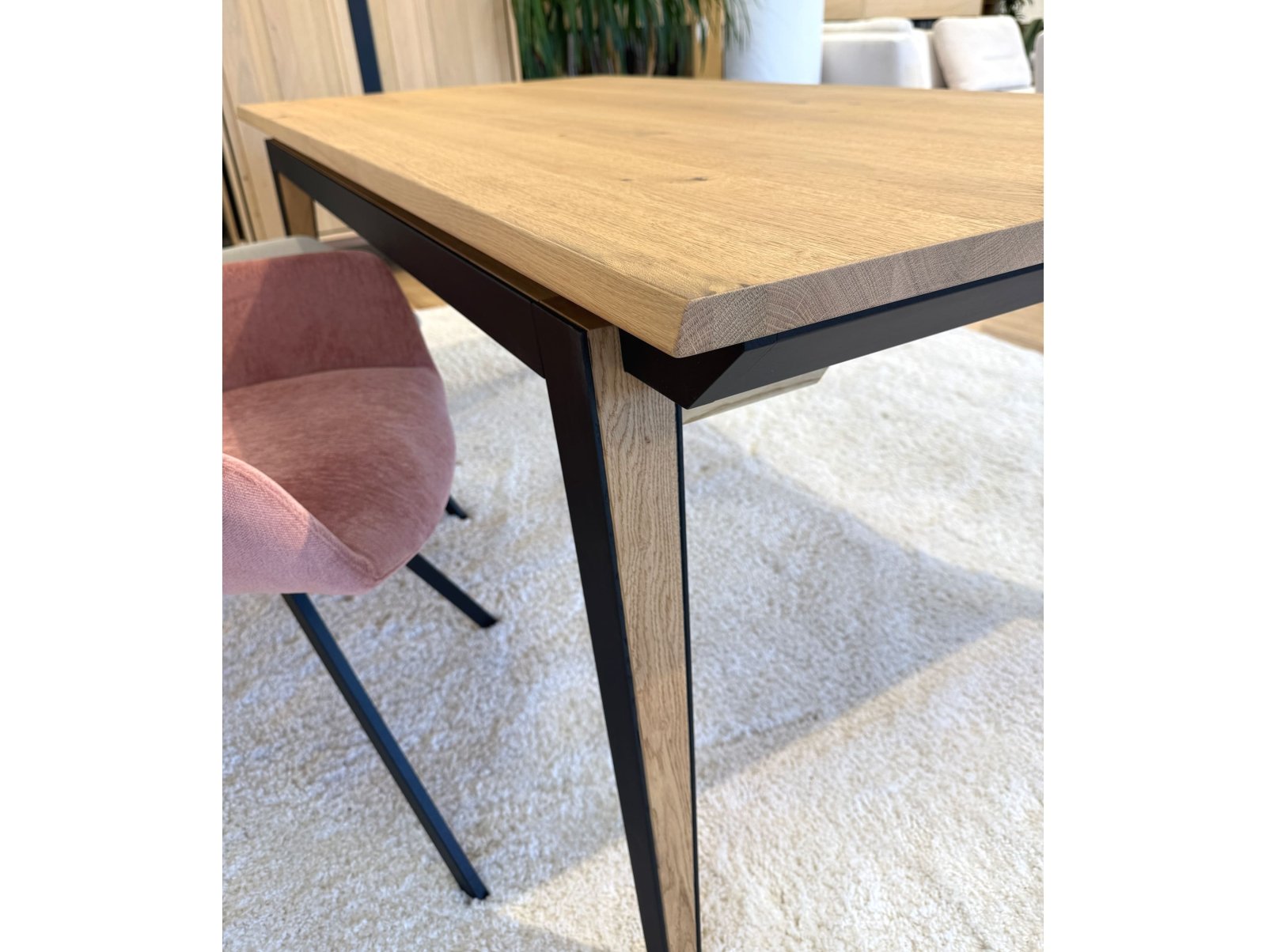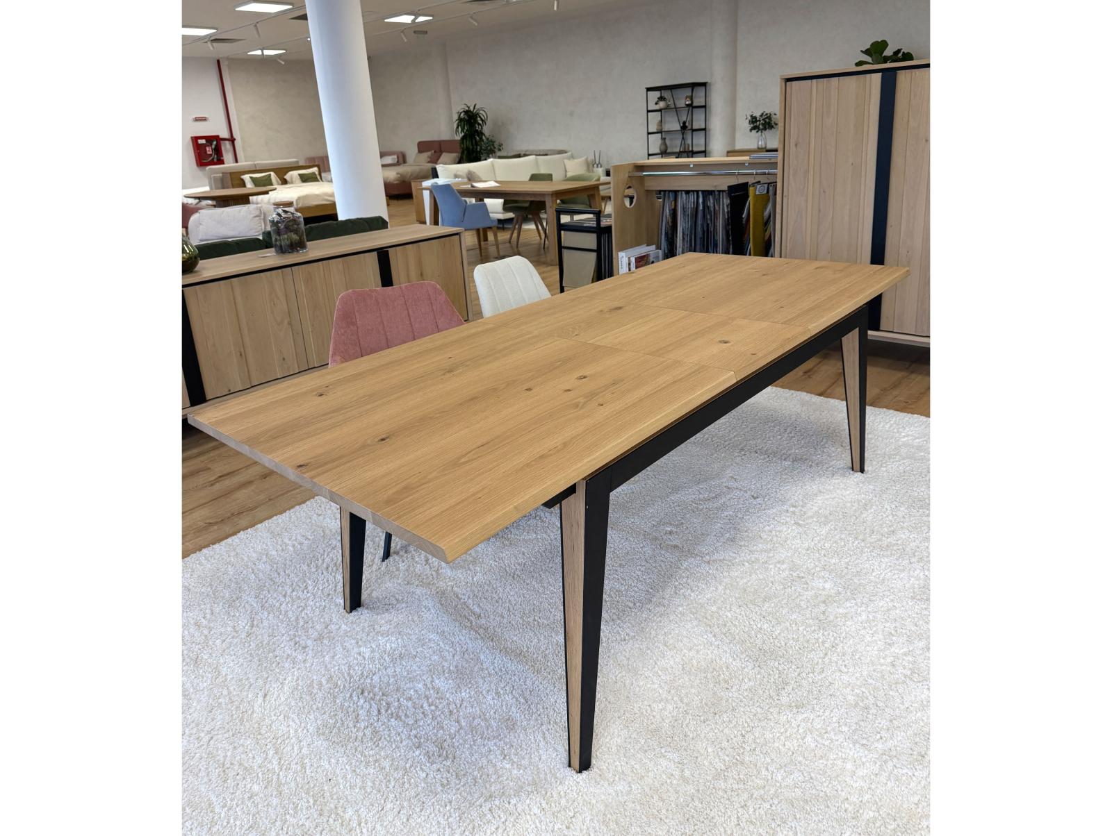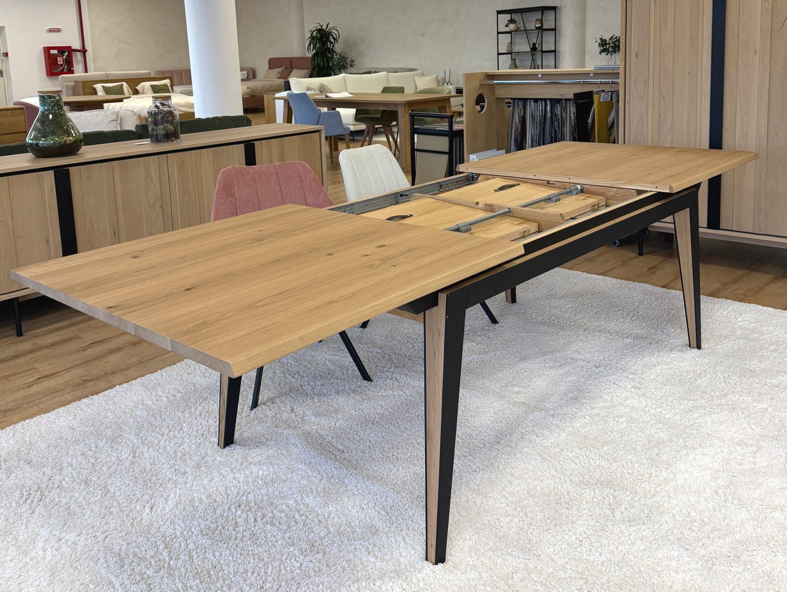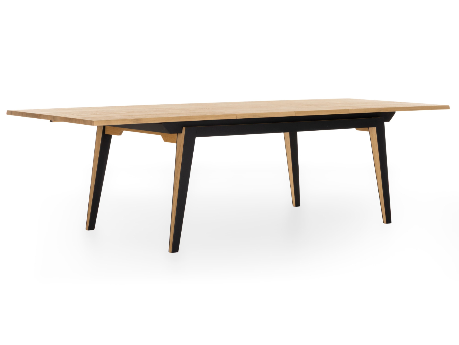 Picioarele si traversele interioare sunt fabricate din lemn masiv de stejar cu ciclu lung de uscare. Targurile sunt fabricate din lemn masiv de fag furniruit cu stejar. Placa si extensia sunt fabricate din PAL bordurat cu stejar masiv si furniruit cu furnir de stejar pe fata si de fag pe dos pentru placa, respectiv furnir de stejar pe ambele fete pentru extensie.