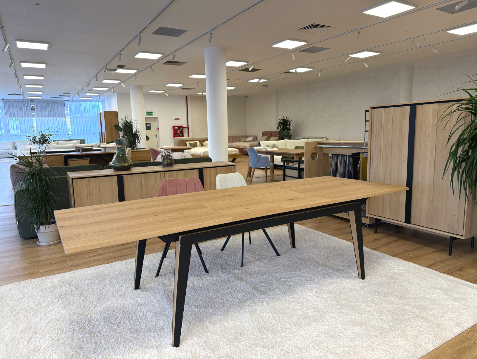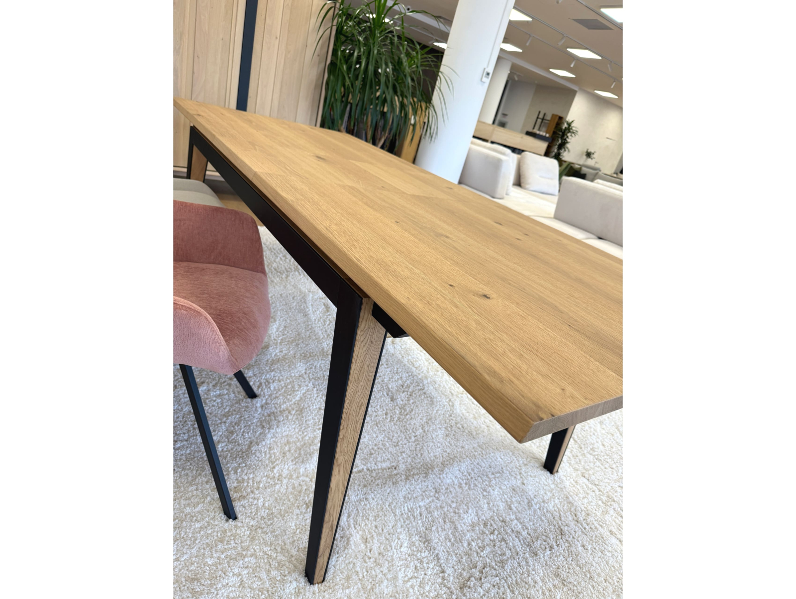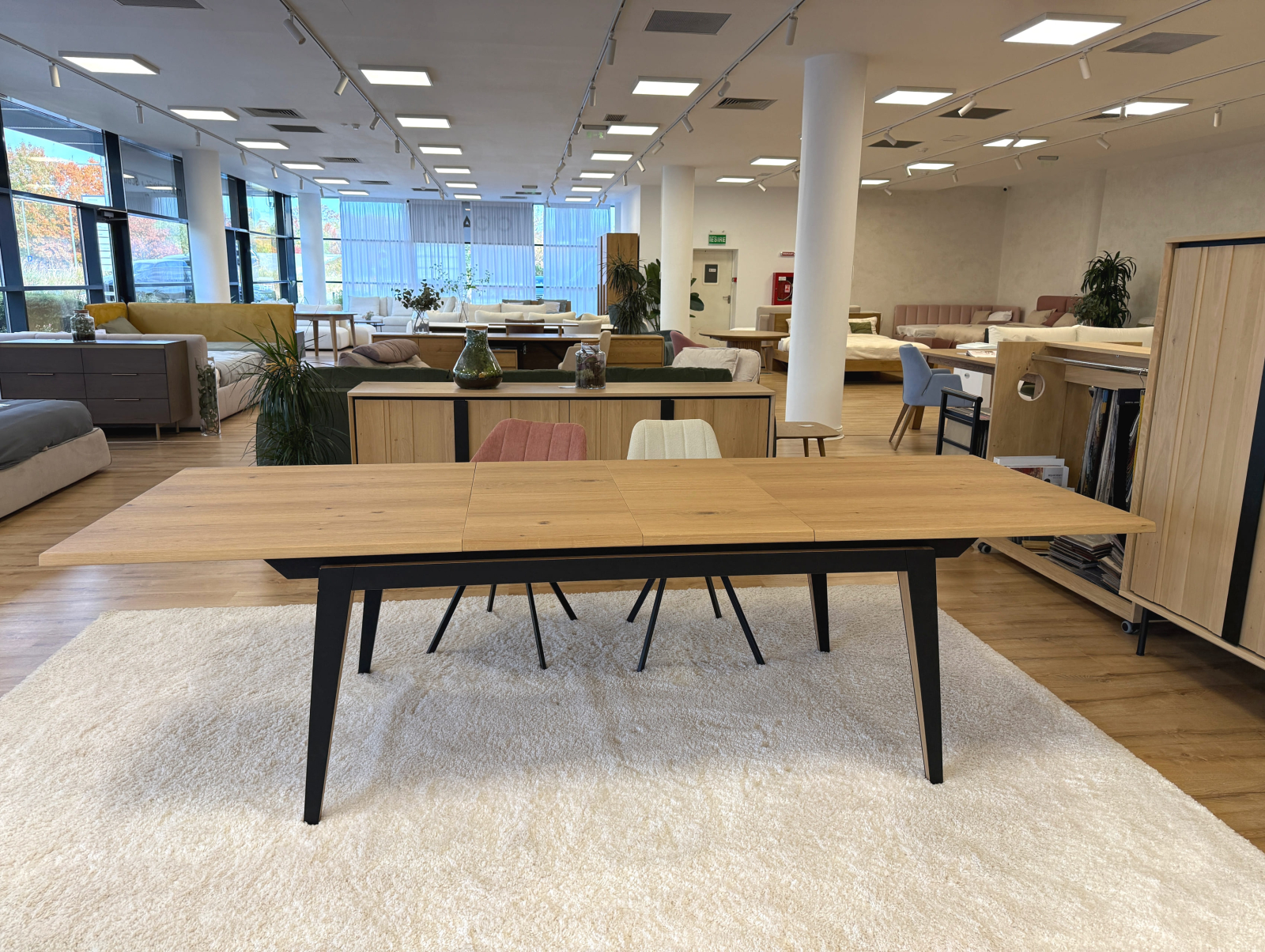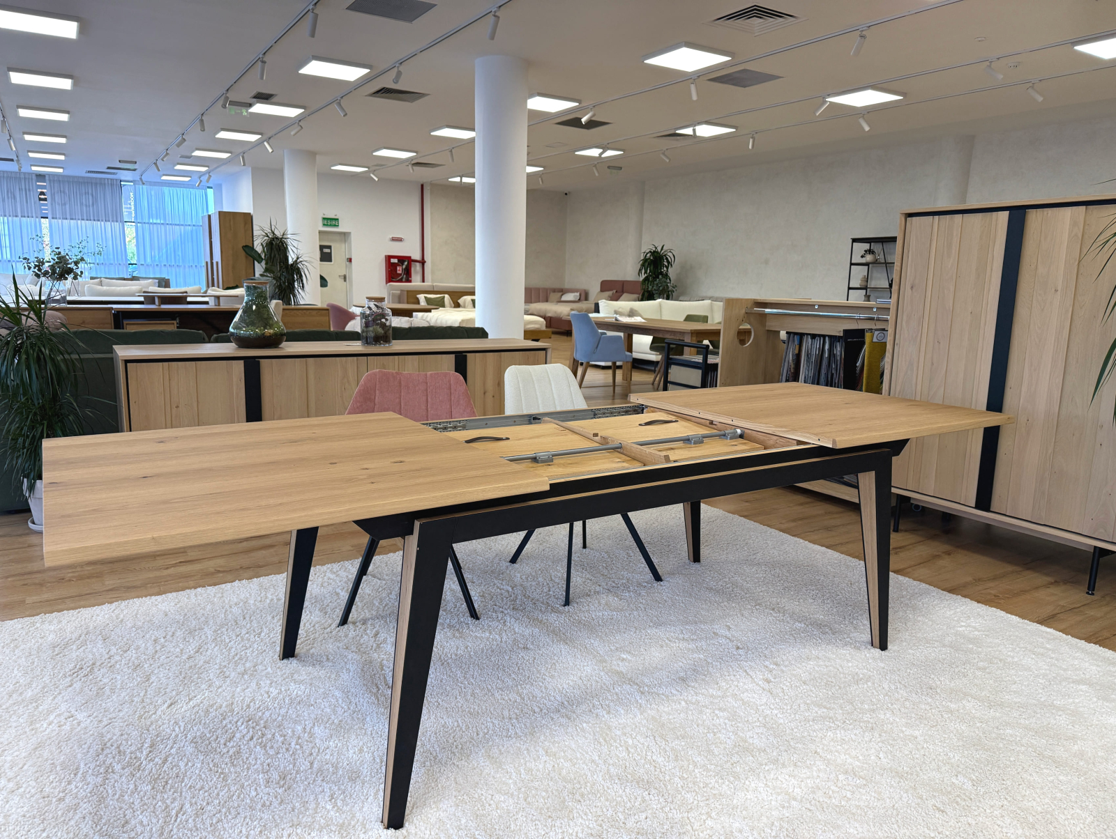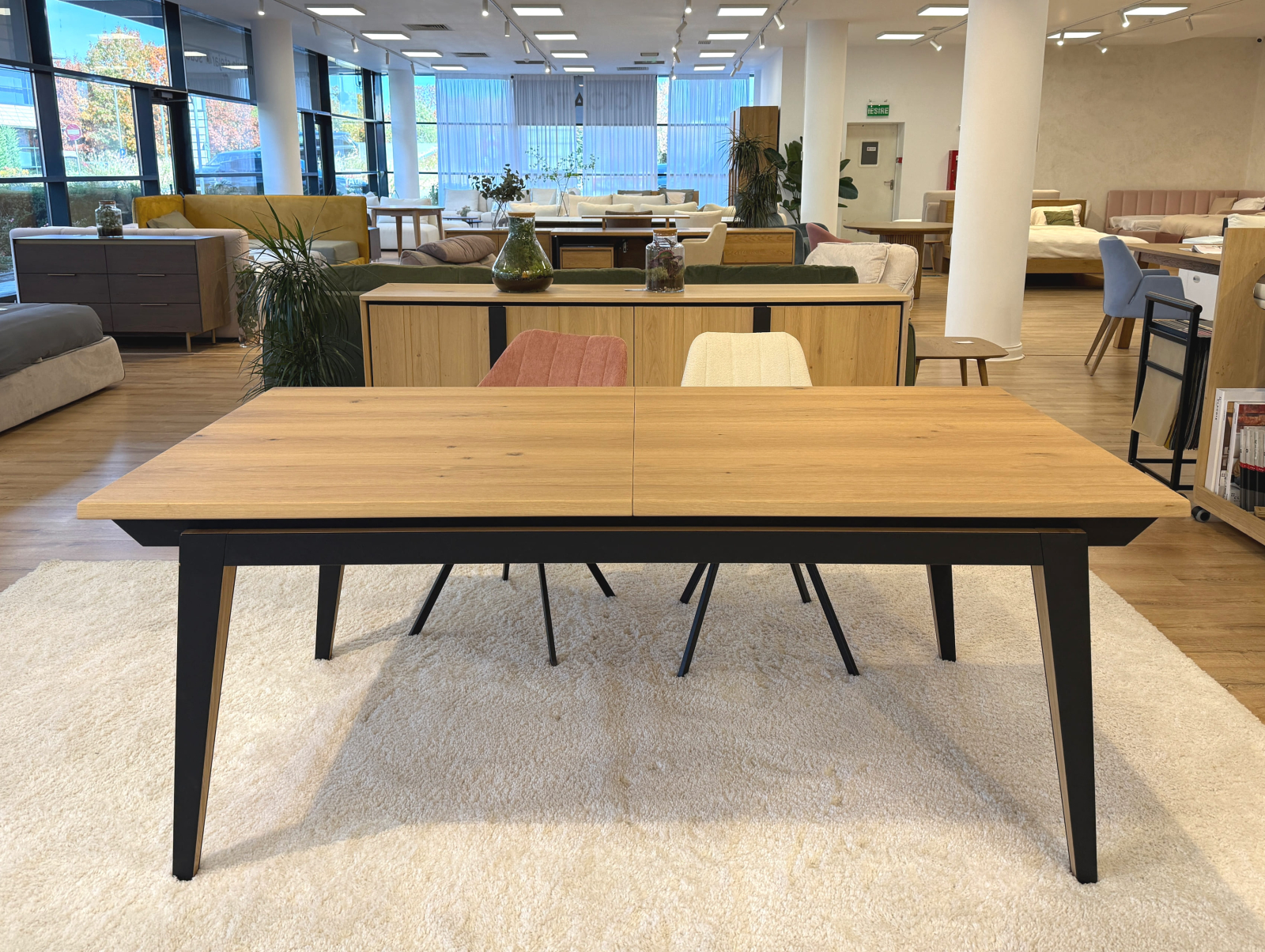 Picioarele si traversele interioare sunt fabricate din lemn masiv de stejar cu ciclu lung de uscare. Targurile sunt fabricate din lemn masiv de fag furniruit cu stejar. Placa si extensia sunt fabricate din PAL bordurat cu stejar masiv si furniruit cu furnir de stejar pe fata si de fag pe dos pentru placa, respectiv furnir de stejar pe ambele fete pentru extensie.
