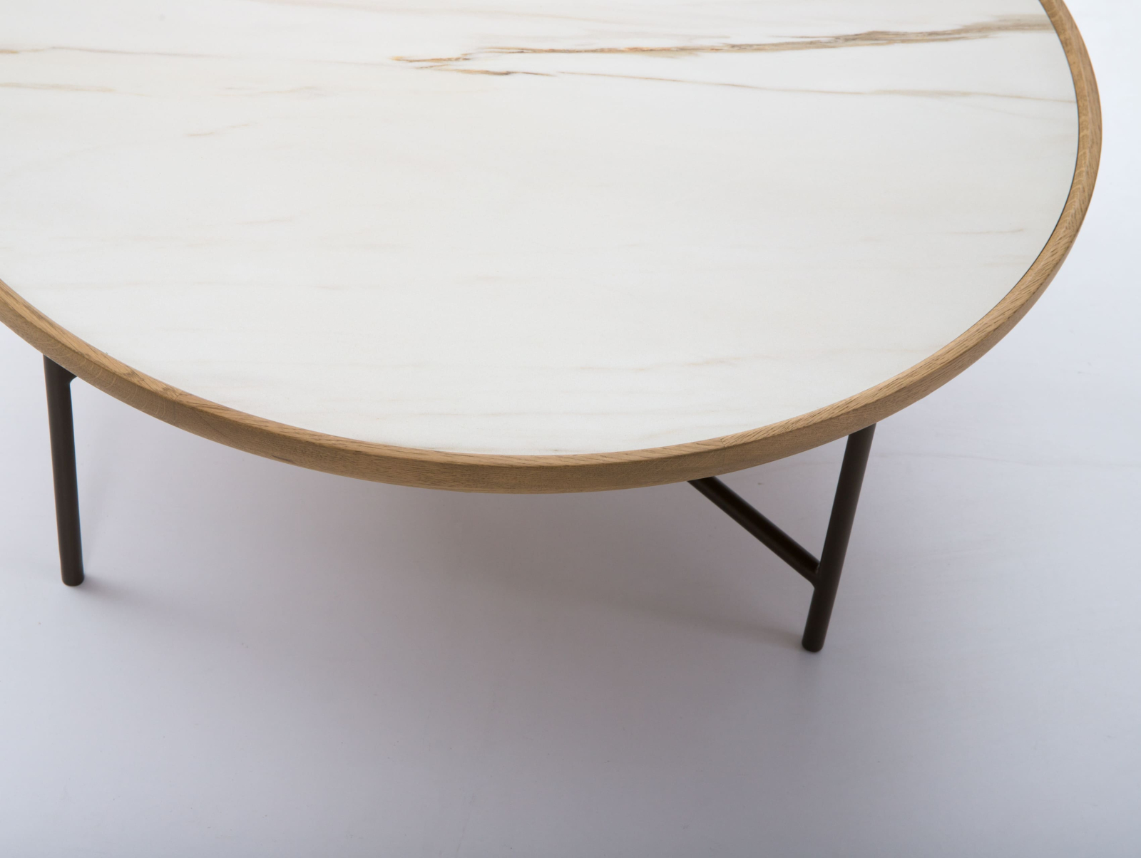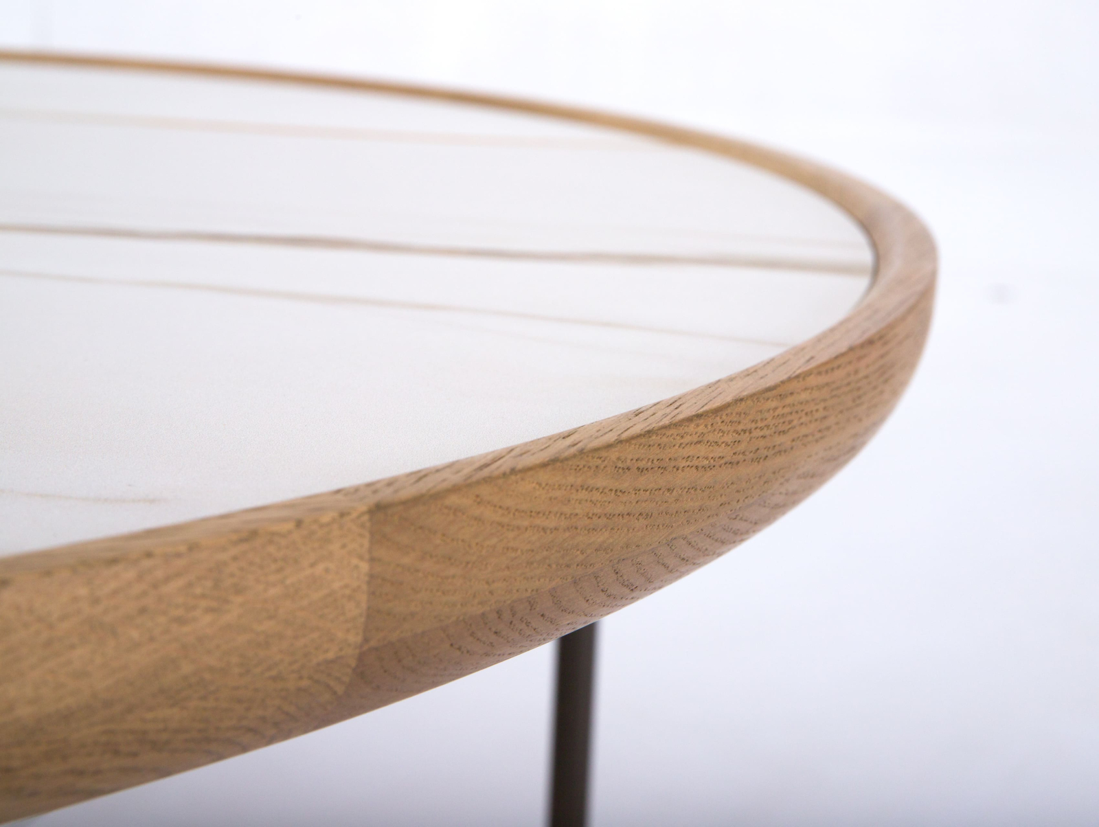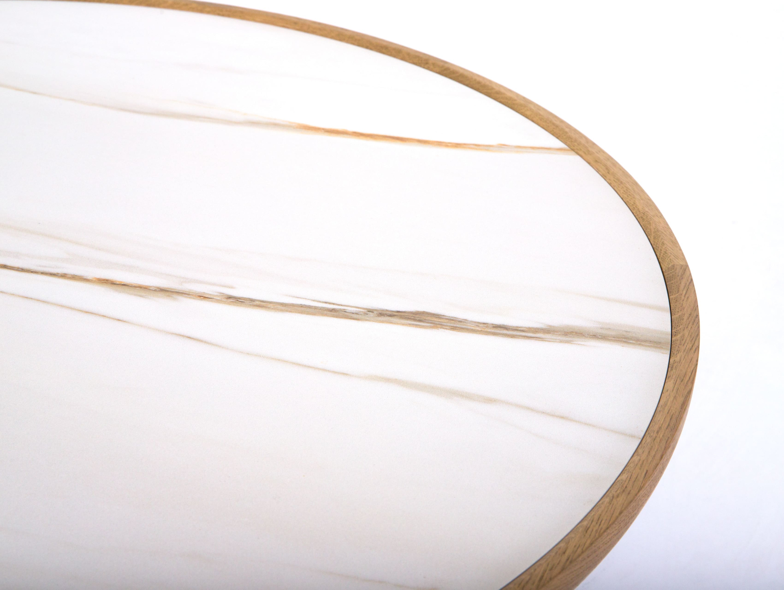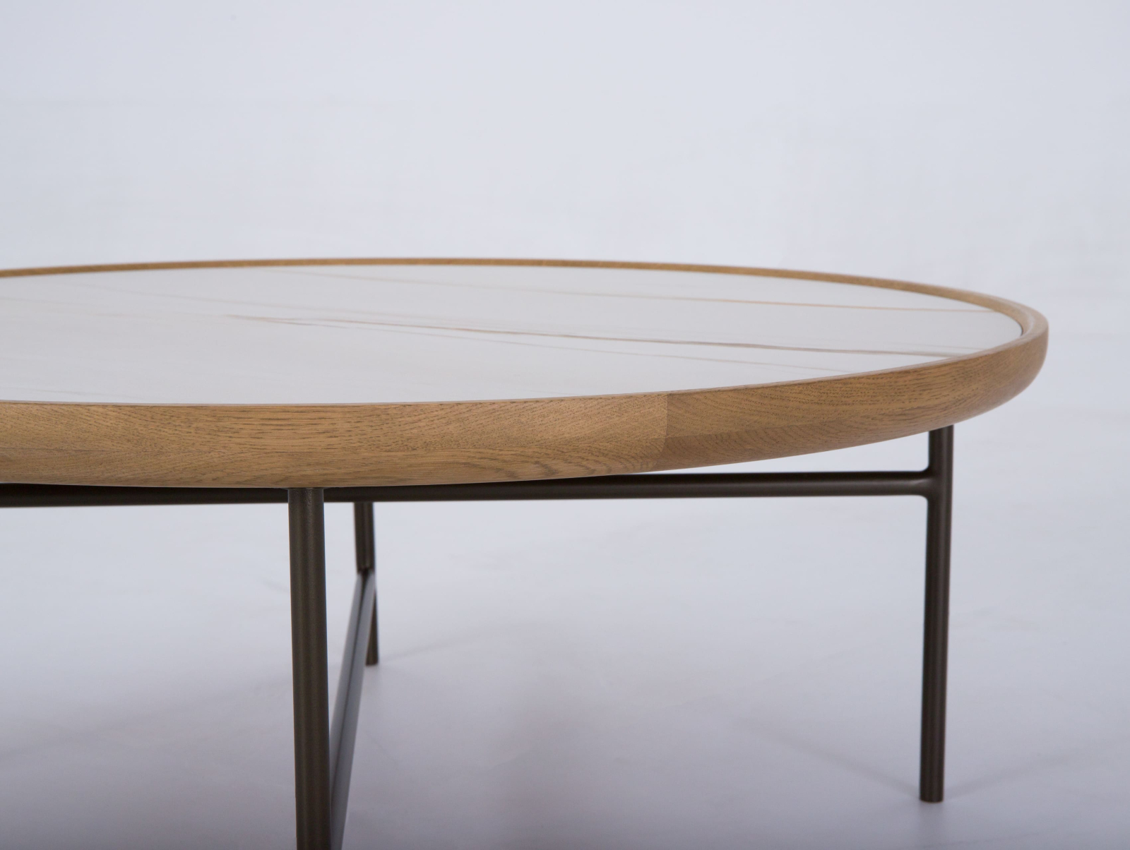Bordura placii masutei cafea este realizata din lemn masiv de stejar cu ciclu lung de uscare. Ceramica este incleaiata pe un panou realizat din PAL furniruit cu furnir de stejar. Picioarele sunt fabricate din otel.