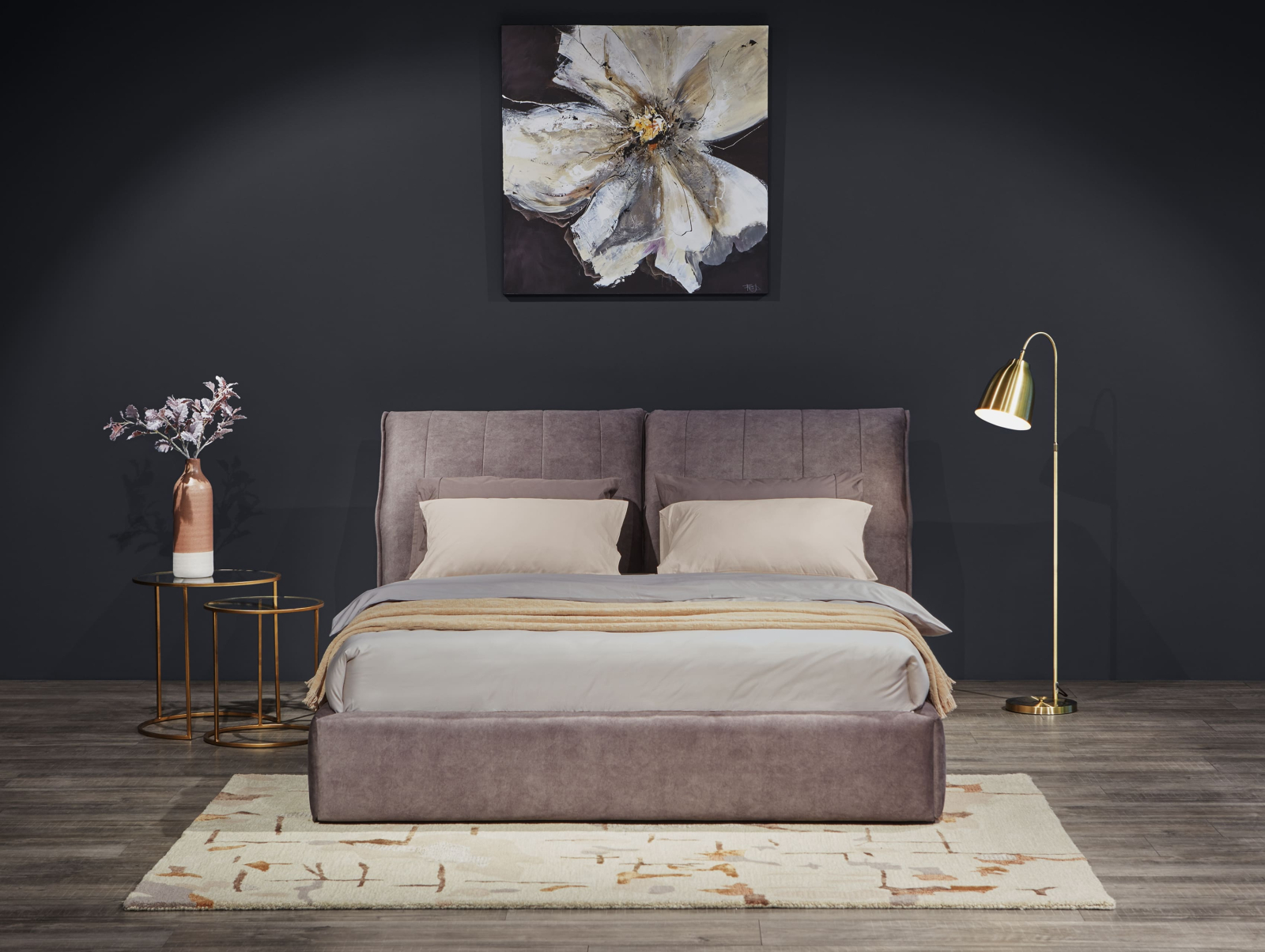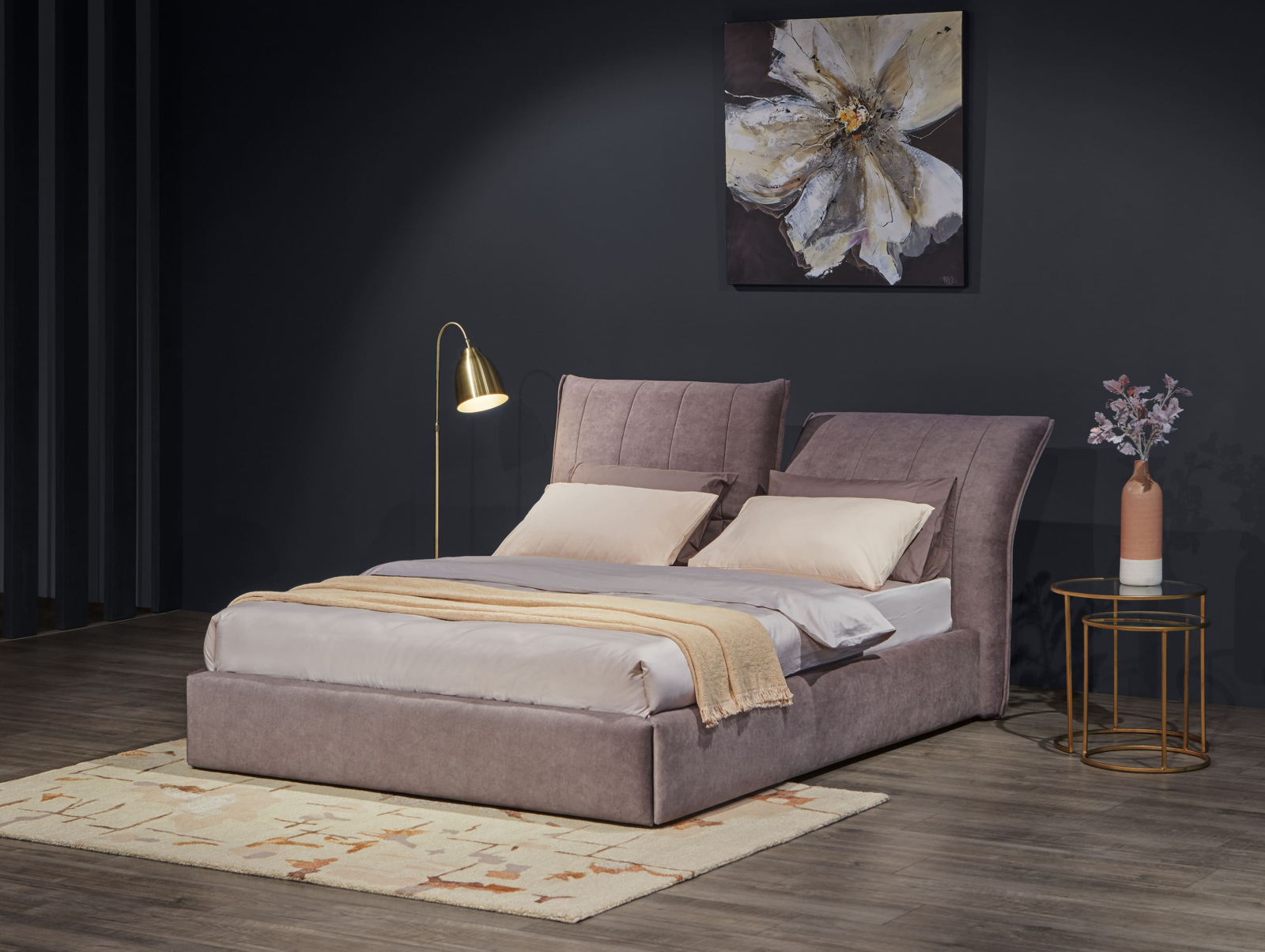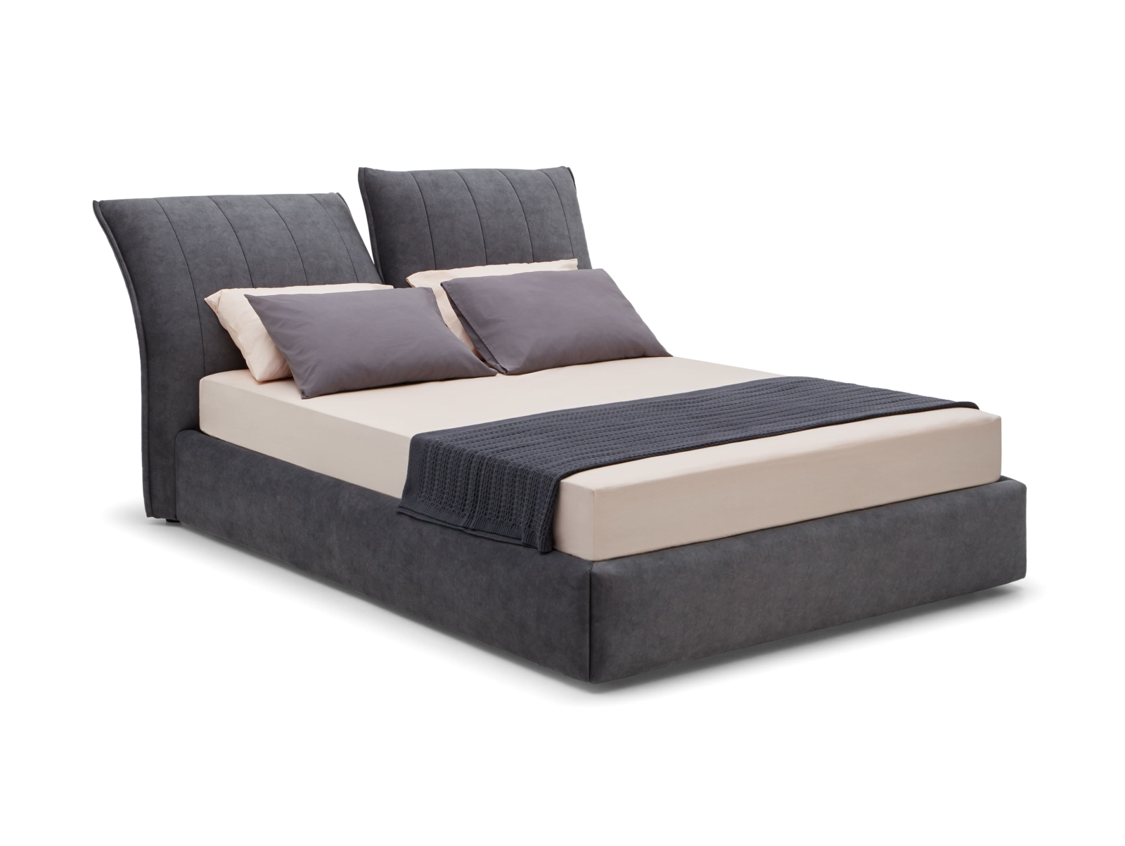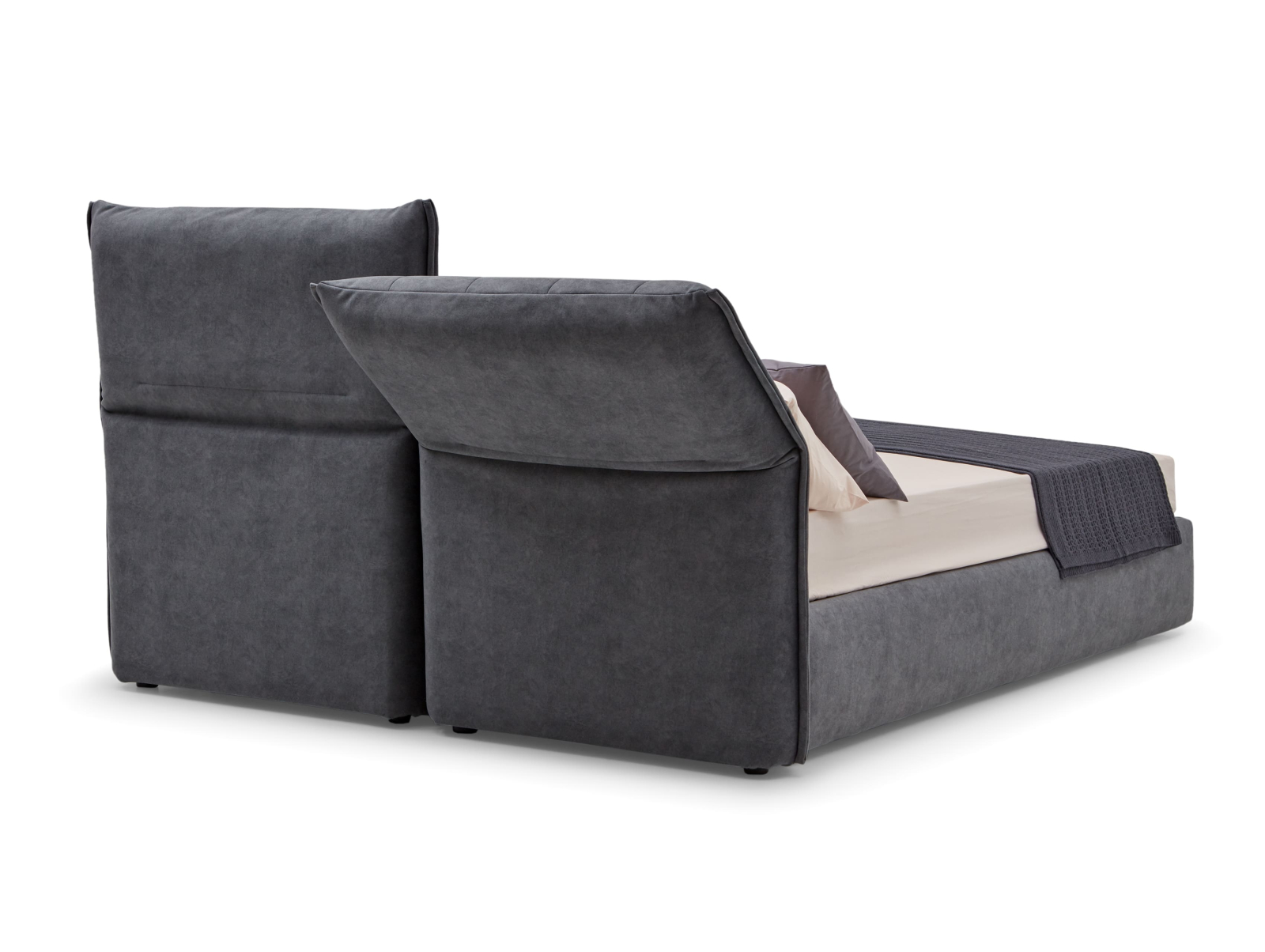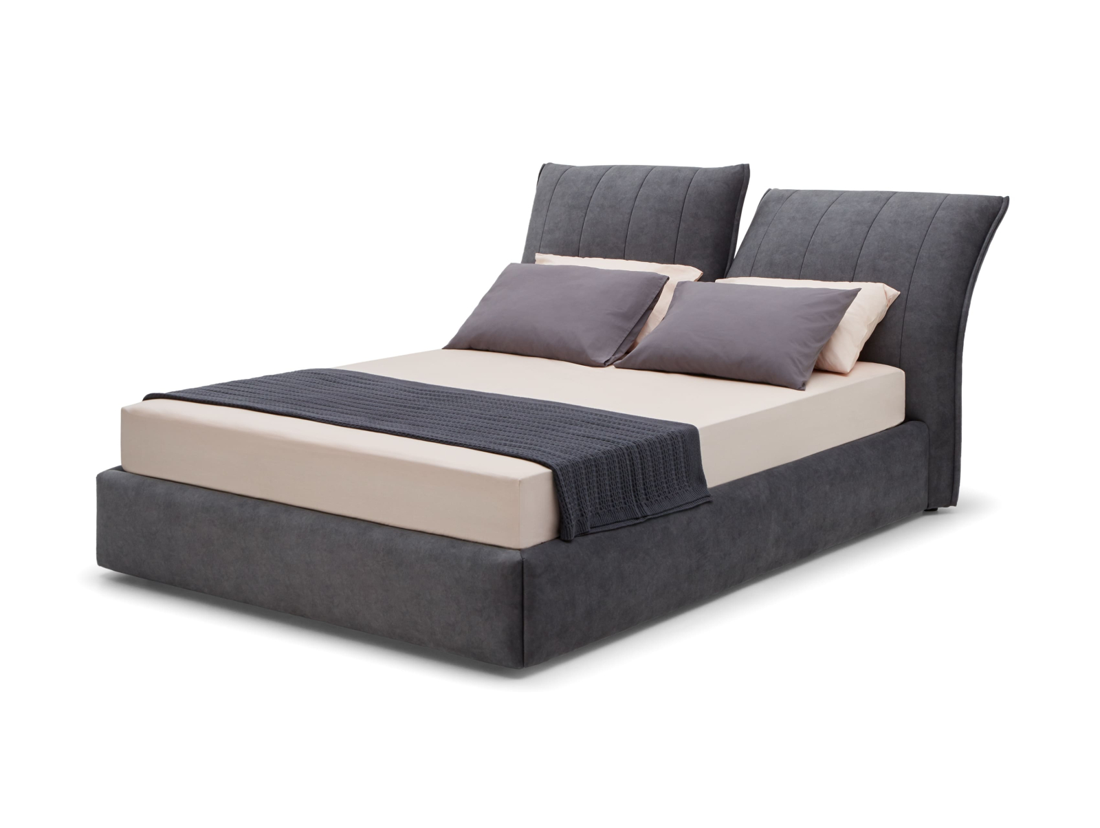 Pat tapitat Ferro cu tablie inalta ajustabila, lada depozitare, somiera metalica, picioare plastic 2cm, stil contemporan, personalizabil