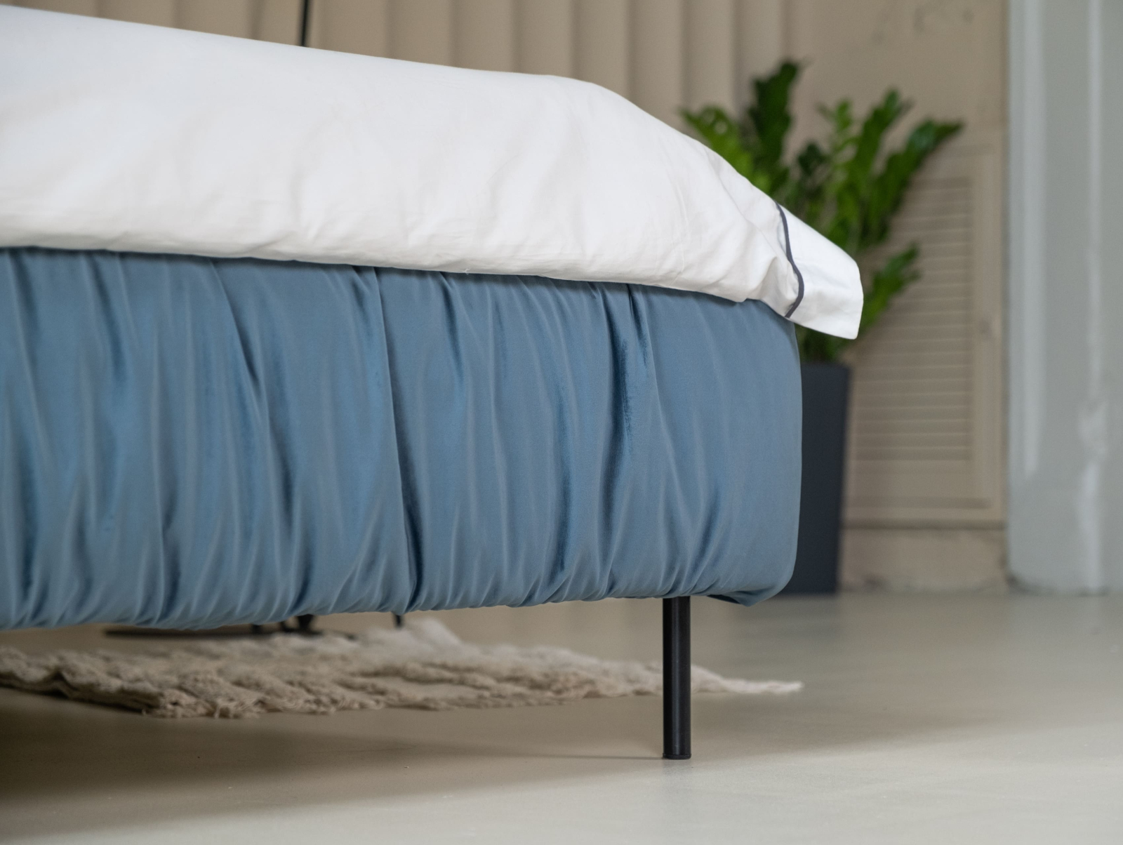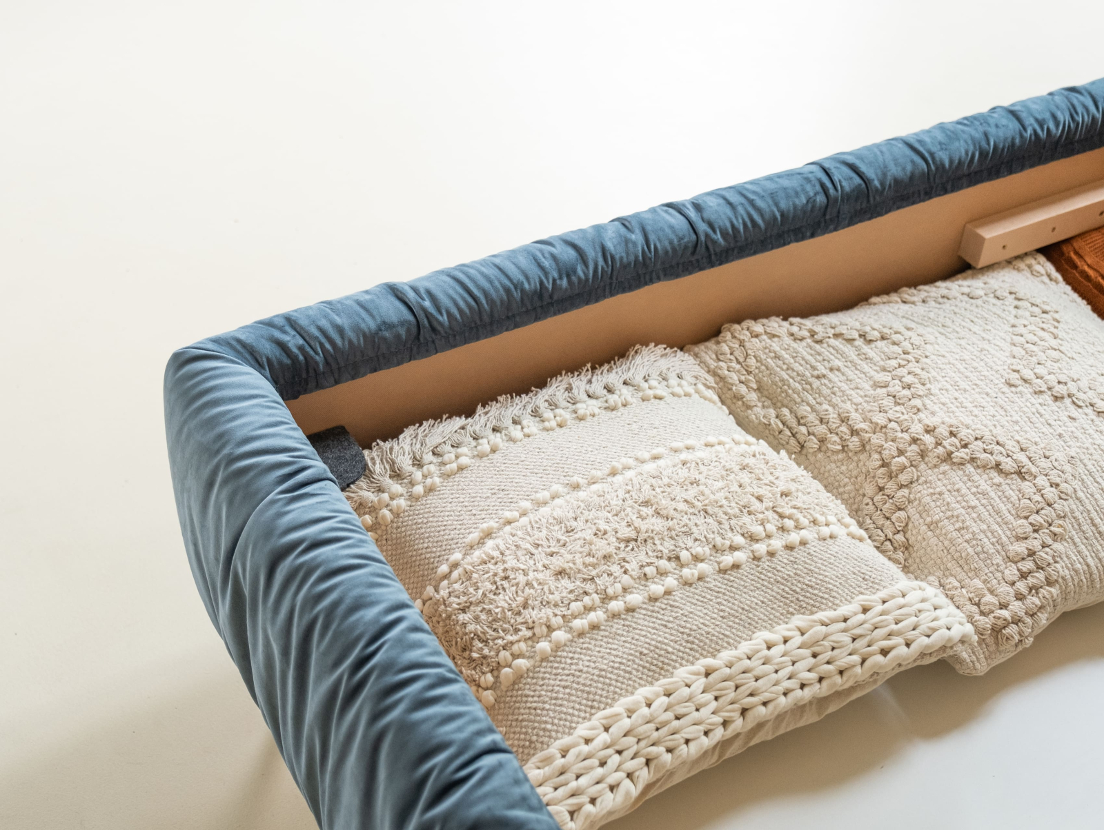 Panoul de fund al cutiei de lenjerie este realizat din PAL laminat alb de 16 mm. Pentru a facilita curatenia sub pat, panoul de fund este realizat din trei elemente ce pot fi miscate independent una de alta.