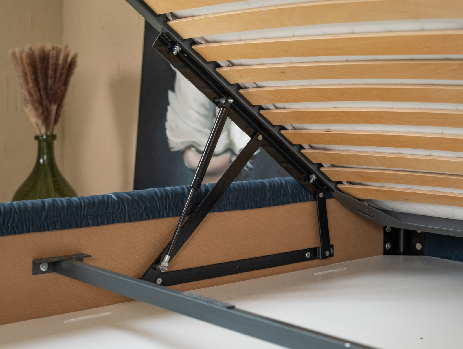 Optional, patul poate fi echipat cu un mecanism de ridicare cu gaz si o nisa pentru depozitarea lenjeriei de pat.