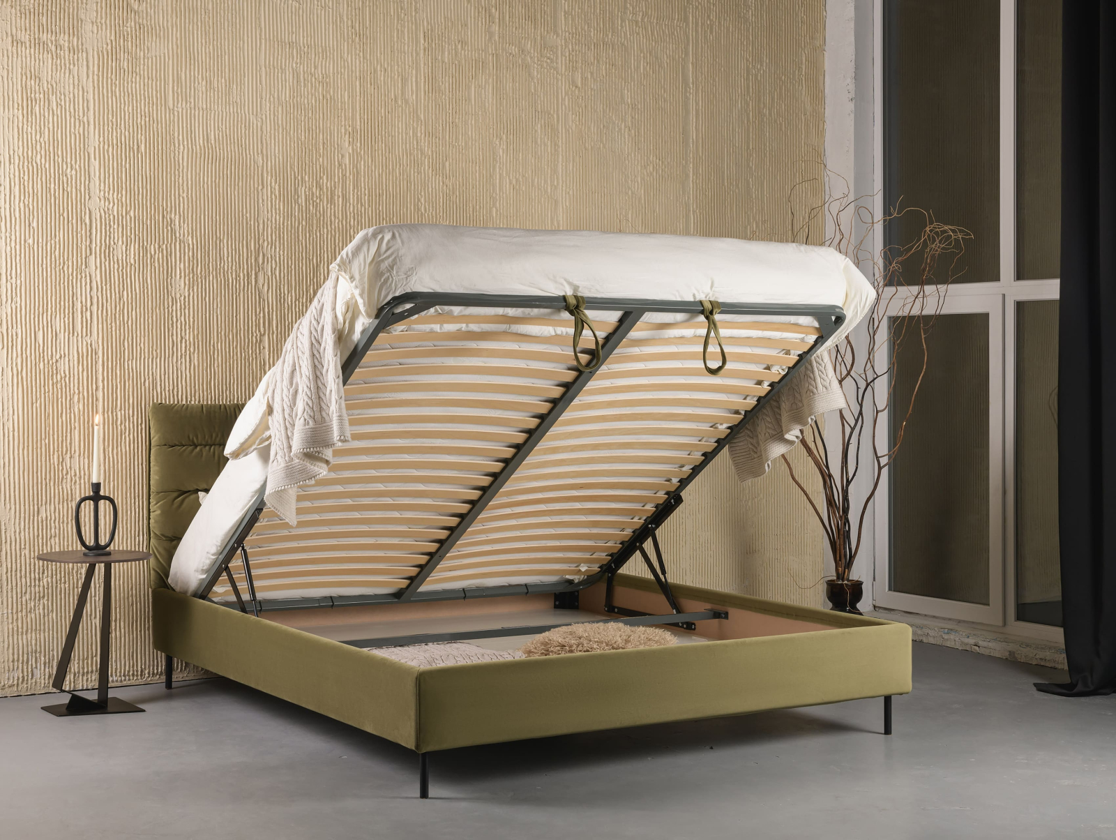 Optional, patul poate fi echipat cu un mecanism de ridicare cu gaz si o nisa pentru depozitarea lenjeriei de pat.