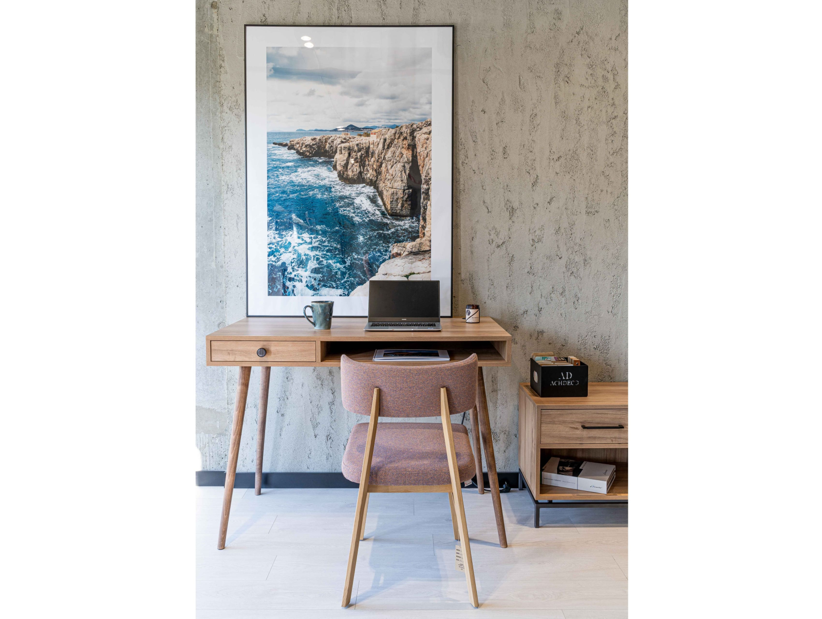 Picioarele din stejar sunt disponibile in mai multe finisaje, de la tonuri naturale care lasa fibra vizibila pana la nuante inchise, obtinute prin baituri si lacuri rezistente la uzura. Lemnul masiv pastreaza particularitati autentice precum variatii subtile de culoare si noduri punctuale, care dau unicitate fiecarei piese. Scoica este tapitata la alegere in stofa sau piele, cu texturi diferite – de la tesaturi mate, cu tesatura perceptibila, pana la piele cu luciu controlat – pentru a calibra aspectul final in functie de ambient. Paletarul de materiale si culori include numeroase optiuni, grupate in categorii de pret (CAT1–CAT6), diferentierea fiind legata de costul materialului, nu de o ierarhie de calitate. Ansamblul ajunge gata finisat si nu necesita montaj.